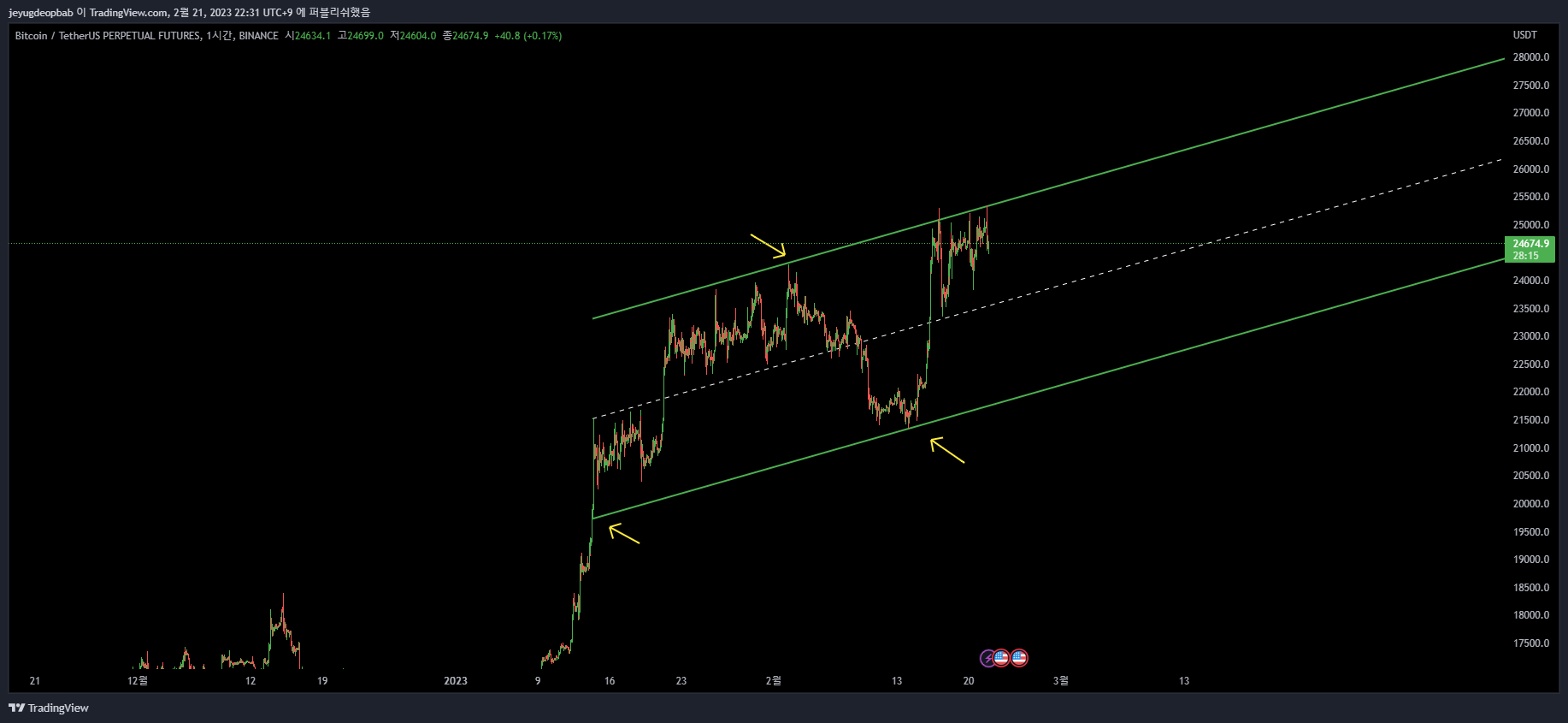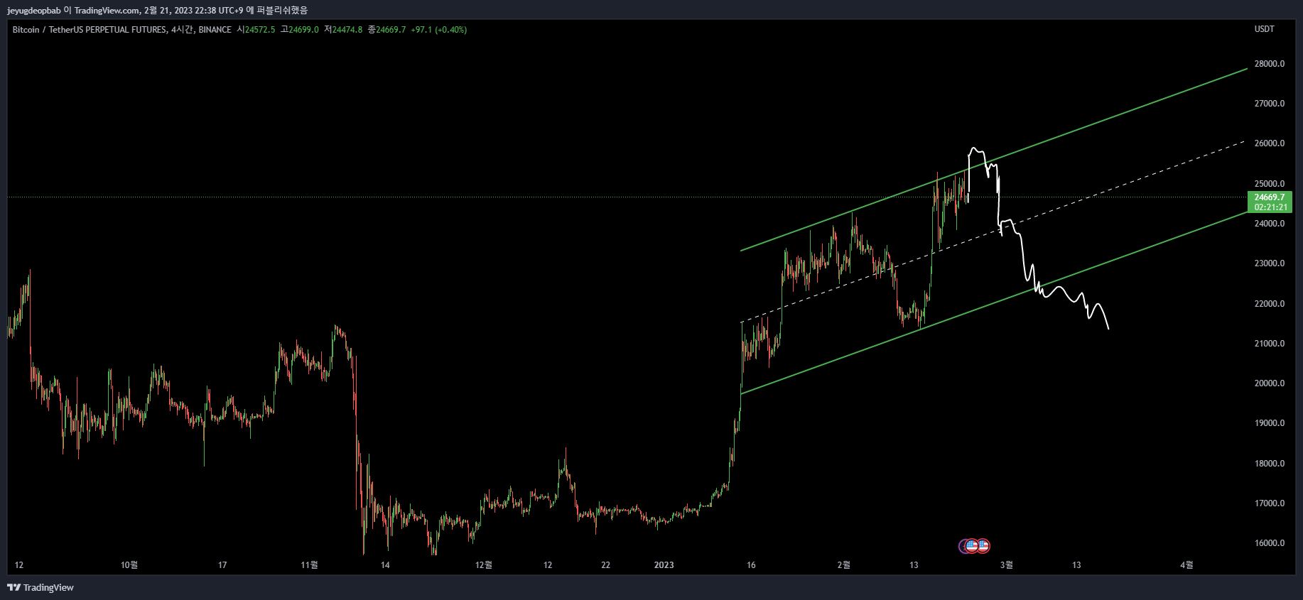 채널 상단에서 저항이 나오고 하락을 하는 뷰로 보고 있습니다