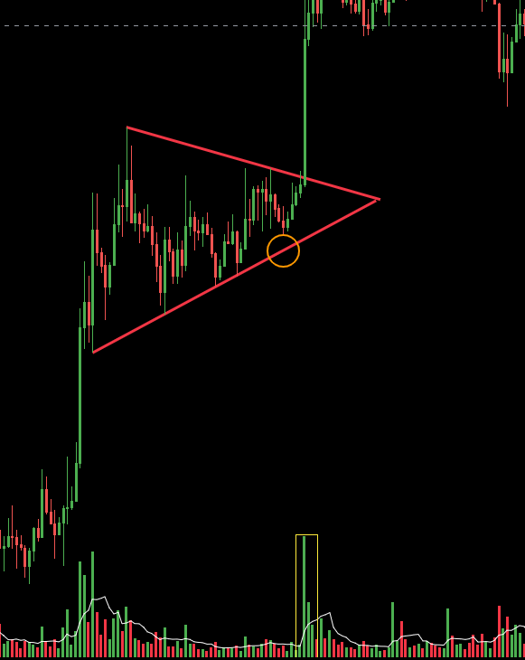 패턴 값을 채우면 상승 할때 거래량이 크게 터지는 걸 보실수 있습니다.수렴 하단도 안 닿고 올렸네요