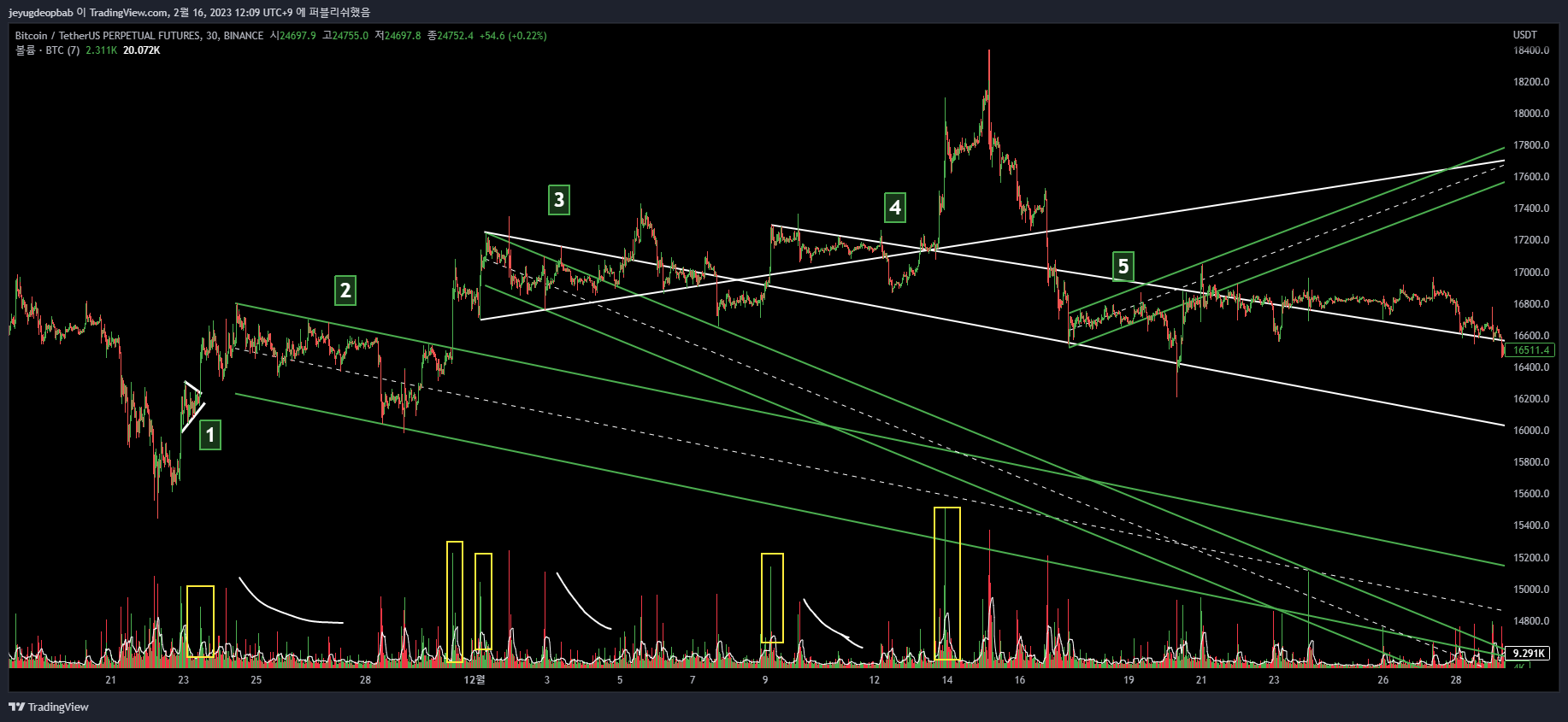 1.비트 바이낸스 선물 차트 최근 베어플래그 패턴이 나온 구간(22.17~22.12.20)