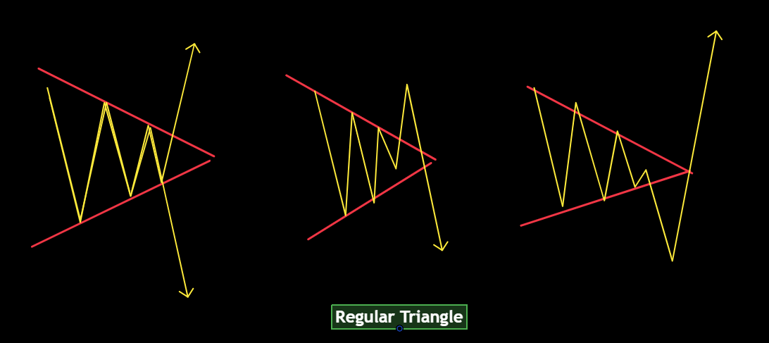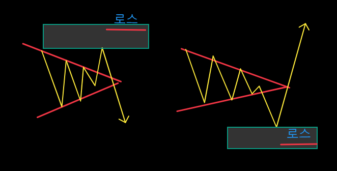 삼각수렴은 오를 수도 있고 내릴 수도 있는 50대 50 패턴이기에 방향이 어느 정도 나온 이후 대응하는 매매를 하는 게 좋습니다. 수렴 중일 때는 매매를 권장하지 않습니다.