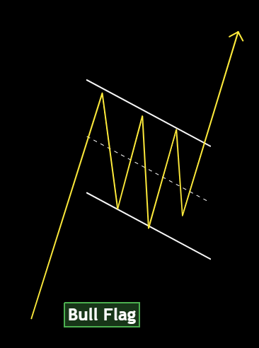 불 플래그는 급격한 가격 상승 이후 우하향 채널 횡보 이후 다시 상승 방향으로 가는 패턴입니다